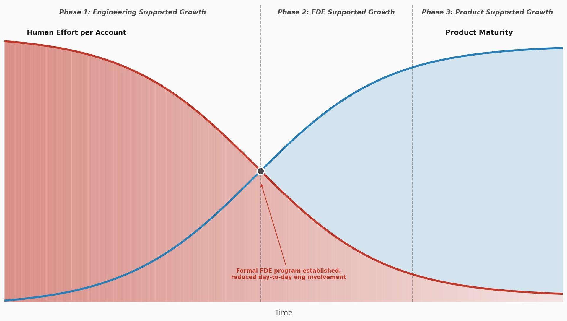 The turning point in this phase comes when FDEs can support more accounts simultaneously. Work that was once custom gets baked into the product through successive releases. Product capability starts to exceed the manual effort required to onboard, and you begin to see early signs of true product maturity. Lower-complexity environments require less FDE involvement, while high-complexity enterprises still justify deep forward deployment.